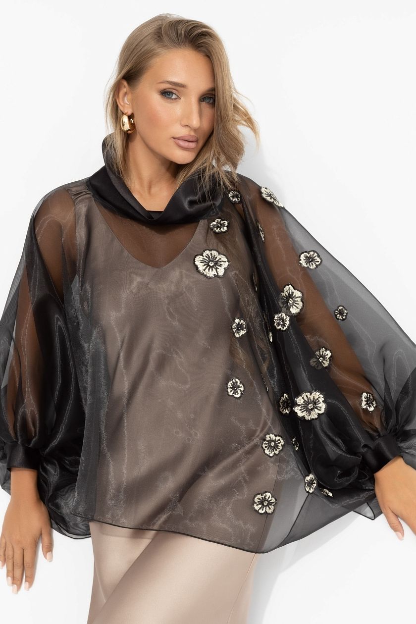 Болеро чёрное с 3D-декором от компании Charutti. Модель объемного кроя из невесомой полупрозрачной органзы. Объемный ворот изделия. 3D-декор в виде цветов с пайетками. Набросьте его поверх базового платья или футболки с джинсами – и обычный день мгновенно преобразится в поэтичную историю.