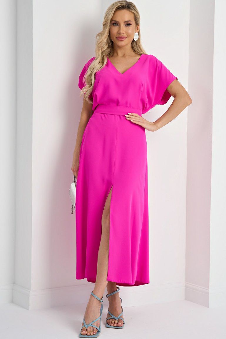 Платье длинное с разрезом от компании Jetty, выполнено из плательного полотна розового цвета. Модель с отрезной талией по переду, в шов вшит широкий пояс, который завязывается сзади. Спинка со средним швом и защипом по центру горловины. Короткий спущенный рукав. V-образный вырез. Идеальный выбор для создания женственного образа.